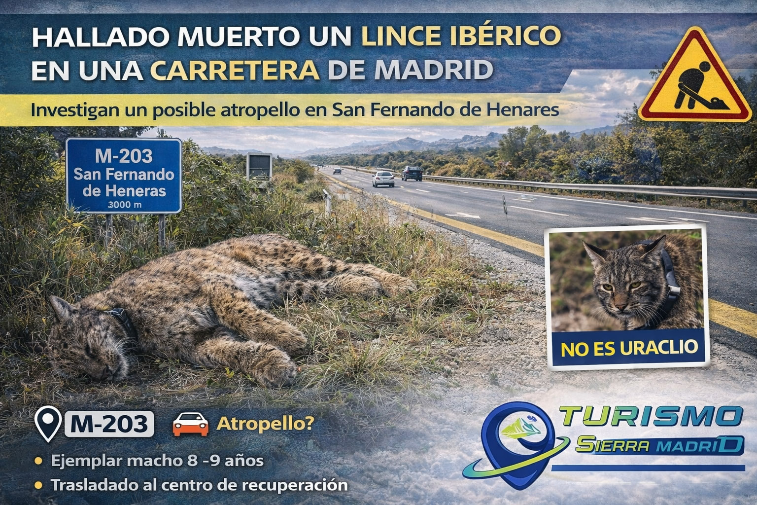 Un ejemplar macho de Lince ibérico, de entre ocho y nueve años, ha sido hallado muerto junto a la M-203, en el término municipal de San Fernando de Henares, con signos compatibles con un posible atropello.