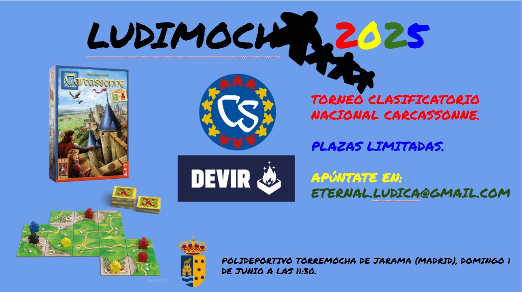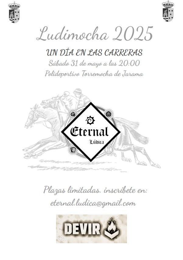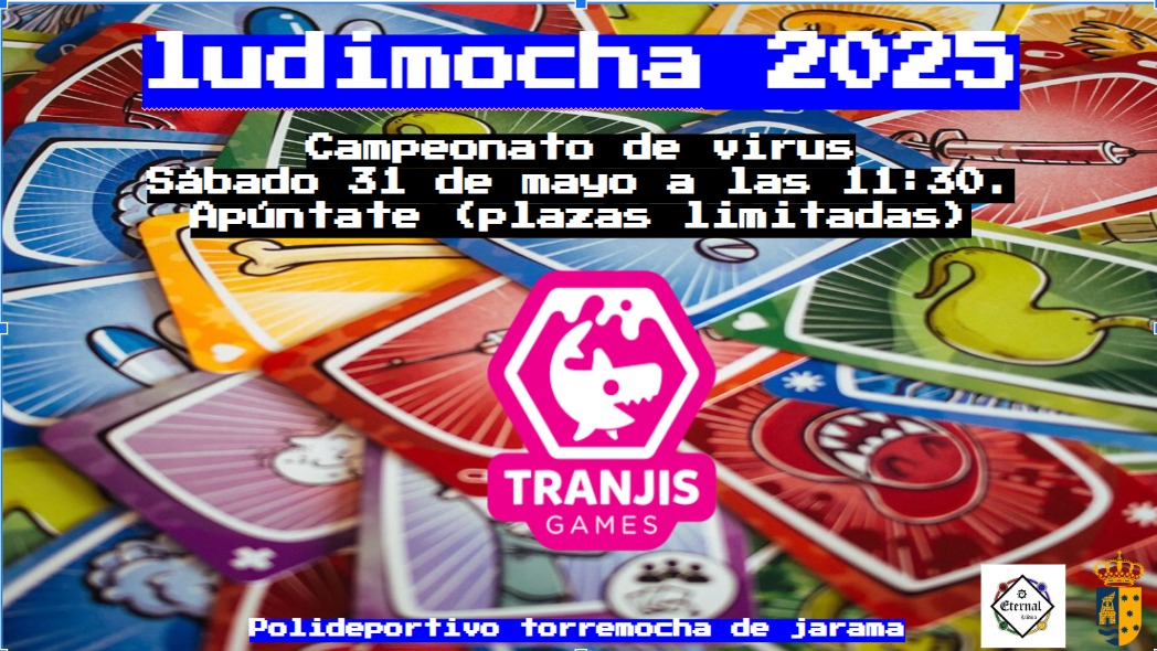 Ludimocha 2025 es la tercera edición oficial de la feria de juegos de mesa organizada por la Asociación Cultural Eternal Lúdica, en colaboración con el Ayuntamiento de Torremocha de Jarama. Dos días de demostraciones, torneos oficiales, zona de prototipos, ludoteca y espacios temáticos para toda la familia.